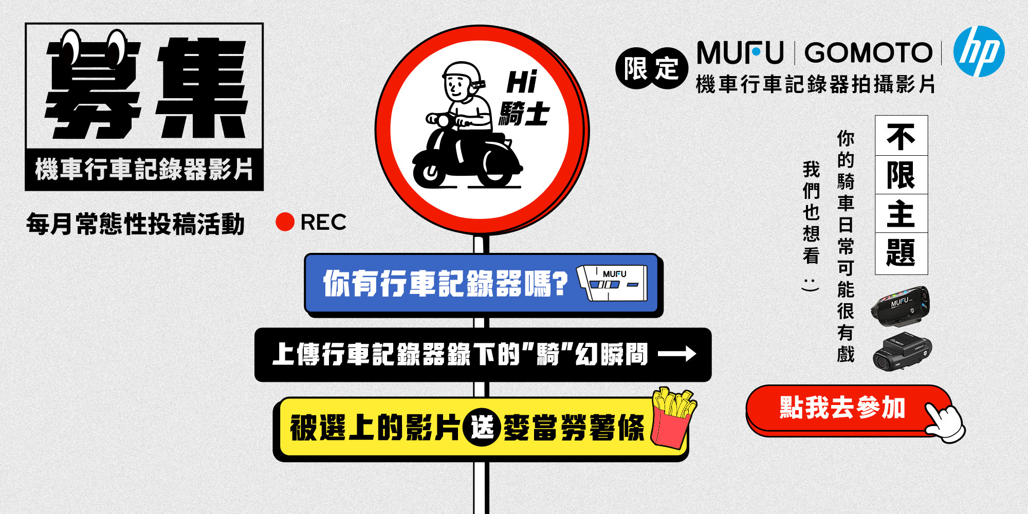 ❶ 需使用MUFU/GOMOTO/HP機車行車記錄器拍攝 (影片需可辨識型號浮水印)。