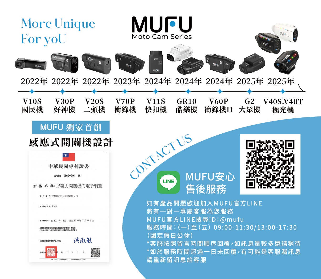 再次衷心感謝您願意選擇MUFU機車行車記錄器,MUFU是台灣原創設計品牌,本公司「台灣微米科技股份有限公司」自2002 年成立以來,累積23年的研發技術及市場研究,從生活相機、攝影機到行車記錄器產品的研發、設計、技術,打造出每款獨一無二的產品,MUFU首創申請獨家專利「感應式開關機 即扣即錄」產品概念於 2021年推出第一款免牽線安裝在機車上的記錄器 V10S國民機,即扣即錄概念的產品於台灣銷售超過二十萬台,並行銷全世界各地,成功把台灣創新推向國際,累積超過百萬台的用戶體驗。MUFU的產品從規格到價格皆是為移動族群打造高CP值、人性化、獨特設計的專屬體驗。MUFU品牌即將邁入第六年,在此感謝大家支持MUFU原創產品,選擇原創就是選擇安心。