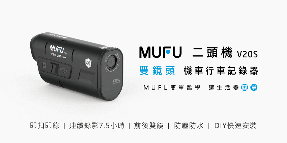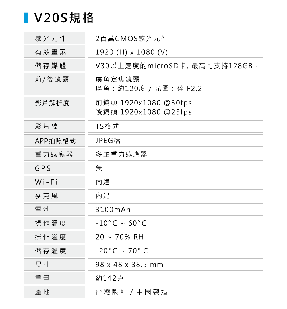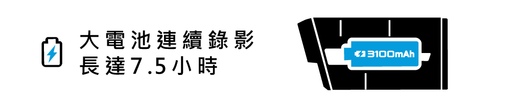 V20S採用18650電池,內建3100mAh超大電量,前後鏡頭連續錄影可長達7.5小時,優於市售的三倍電量