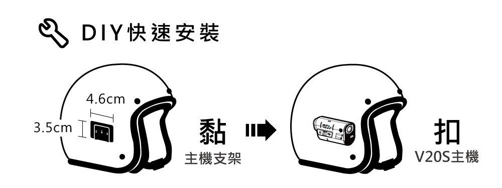 V20S「安全帽主機支架」安裝位置為戴上安全帽右邊,黏上即安裝完成,超級簡單