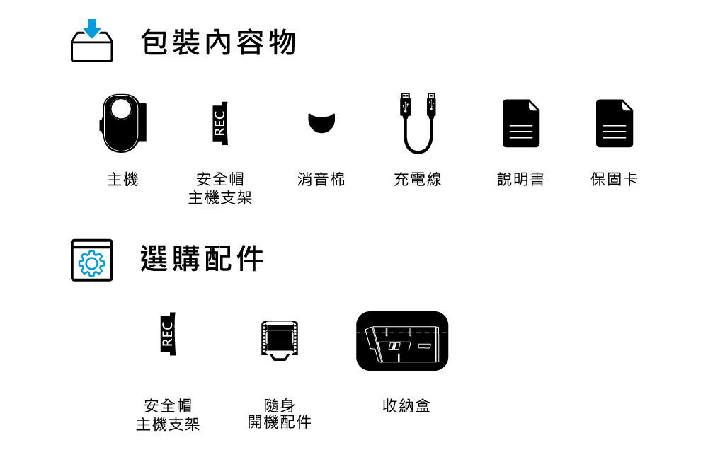 V20S主機一台.安全帽支架x1.Type.c充電線x1.消音棉x2.說明書x1.保固卡x1