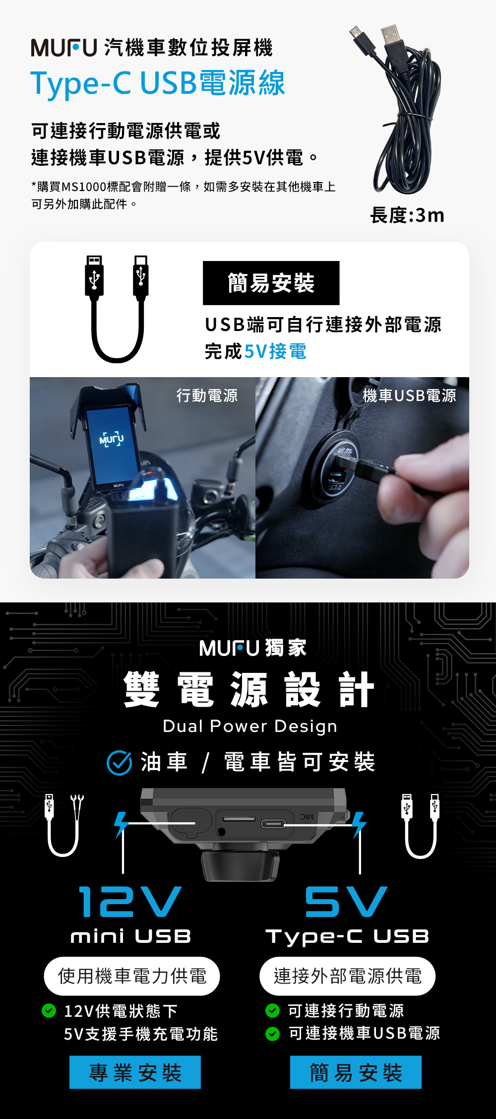 Type-C USB電源線適用MUFU汽機車數位投屏機MS1000,可連接行動電源供電或連接機車USB電源,提供5V供電。