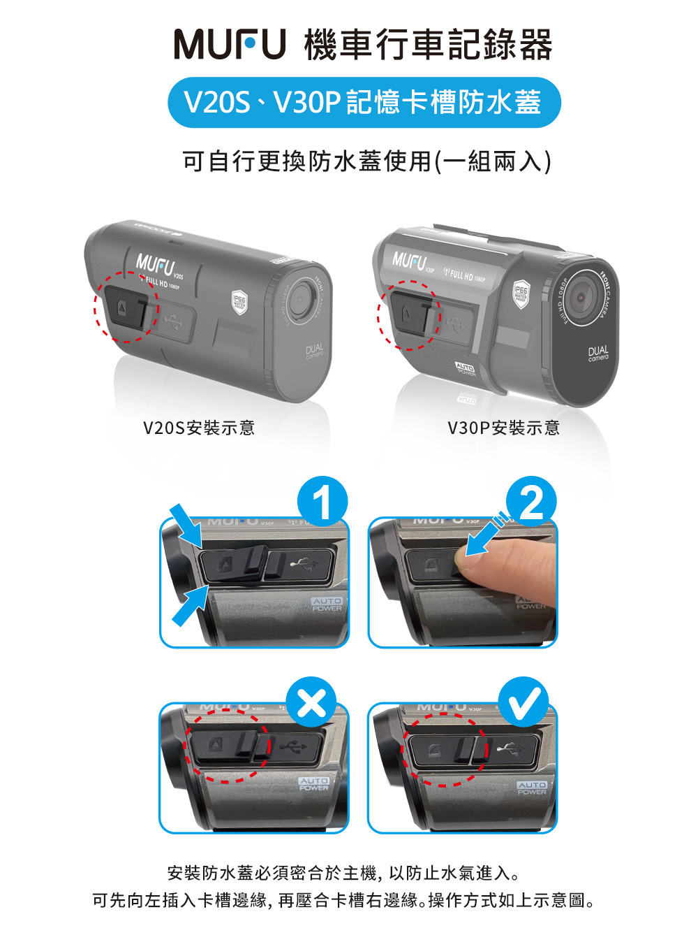 若不小心遺失原本標配的記憶卡槽防水蓋,可以自行購買此配件,一組兩個。可自行更換防水蓋使用,安裝防水蓋必須密合主機,以防水氣進入。