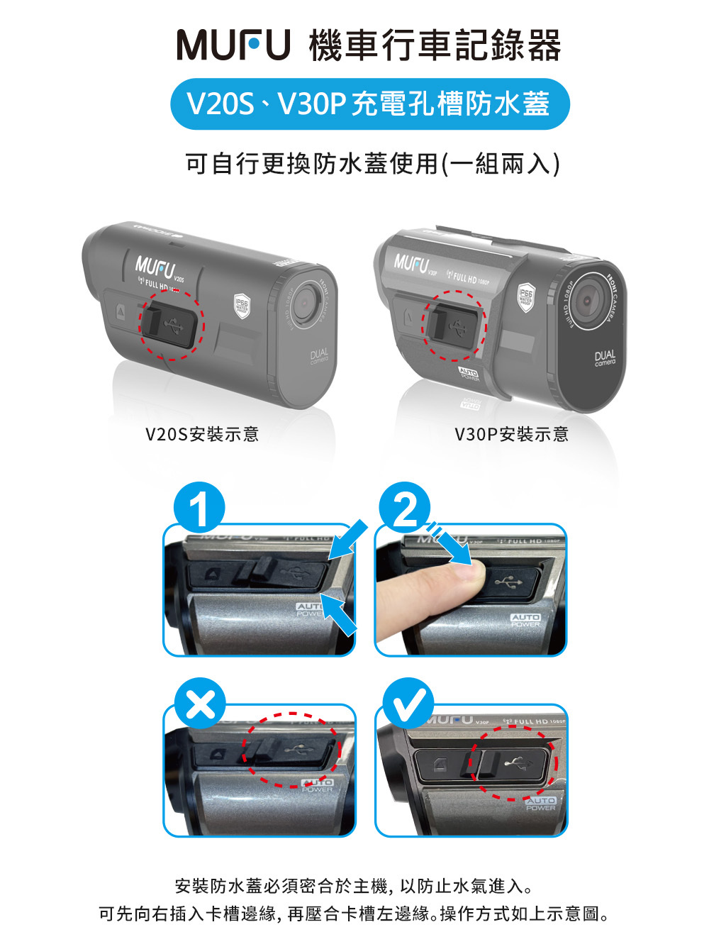 若不小心遺失原本標配的充電孔防水蓋,可以自行購買此配件,一組兩個。可自行更換防水蓋使用,安裝防水蓋必須密合主機,以防水氣進入。