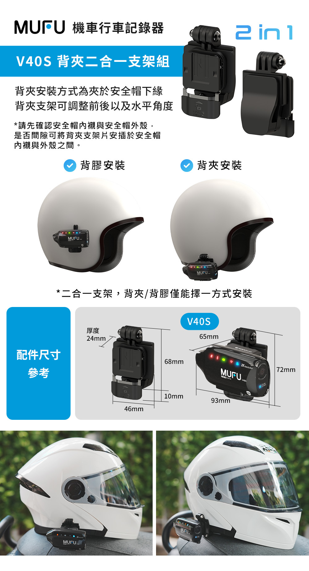 MUFU機車行車記錄器 V40S 專屬背夾二合一支架配件,可背夾或背膠方式擇一安裝,背夾安裝方式為夾於安全帽下緣,背夾支架可調整前後以及水平角度。